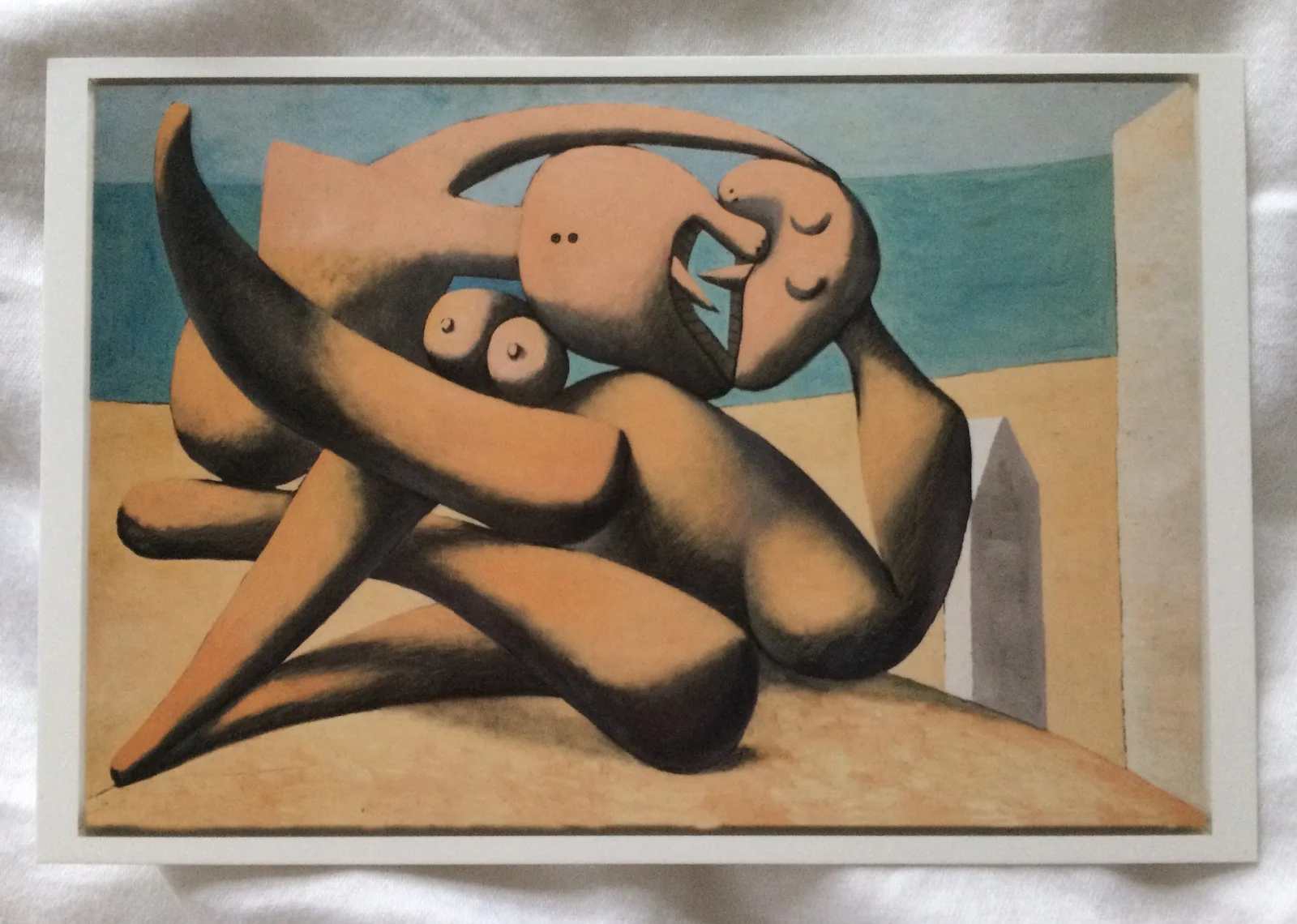 The rooms of beach scenes are airier. Those grey-cream stone crescent figures against foreground and sky, abstract violence. Hideous spikes in a vacuum, puncturing nothing but the empty horizon. Two lovers kiss, their tongues conical stone thorns. Paintings in a hauntingly light palette reduce the female face to several lines, a nose, an eye. They are very clever, but when looking at them, one feels as though something terrible has happened. Guernica, no surprise, is the wrenching crux of the hang. The terrible thing that did happen. The terrified eye moves from one part of the composition to the next, pity brimming from a tightness in the chest. The penny drops; violence, pain, the claustrophobia of the room, the brutishness of the bull, the distraught woman, these were themes all along. The gaze has shifted from the silently weeping lover confined to a chair, obese and mutilated seaside bathers, skulls on a table, to the inarticulate anguish of war, the household ruptured.